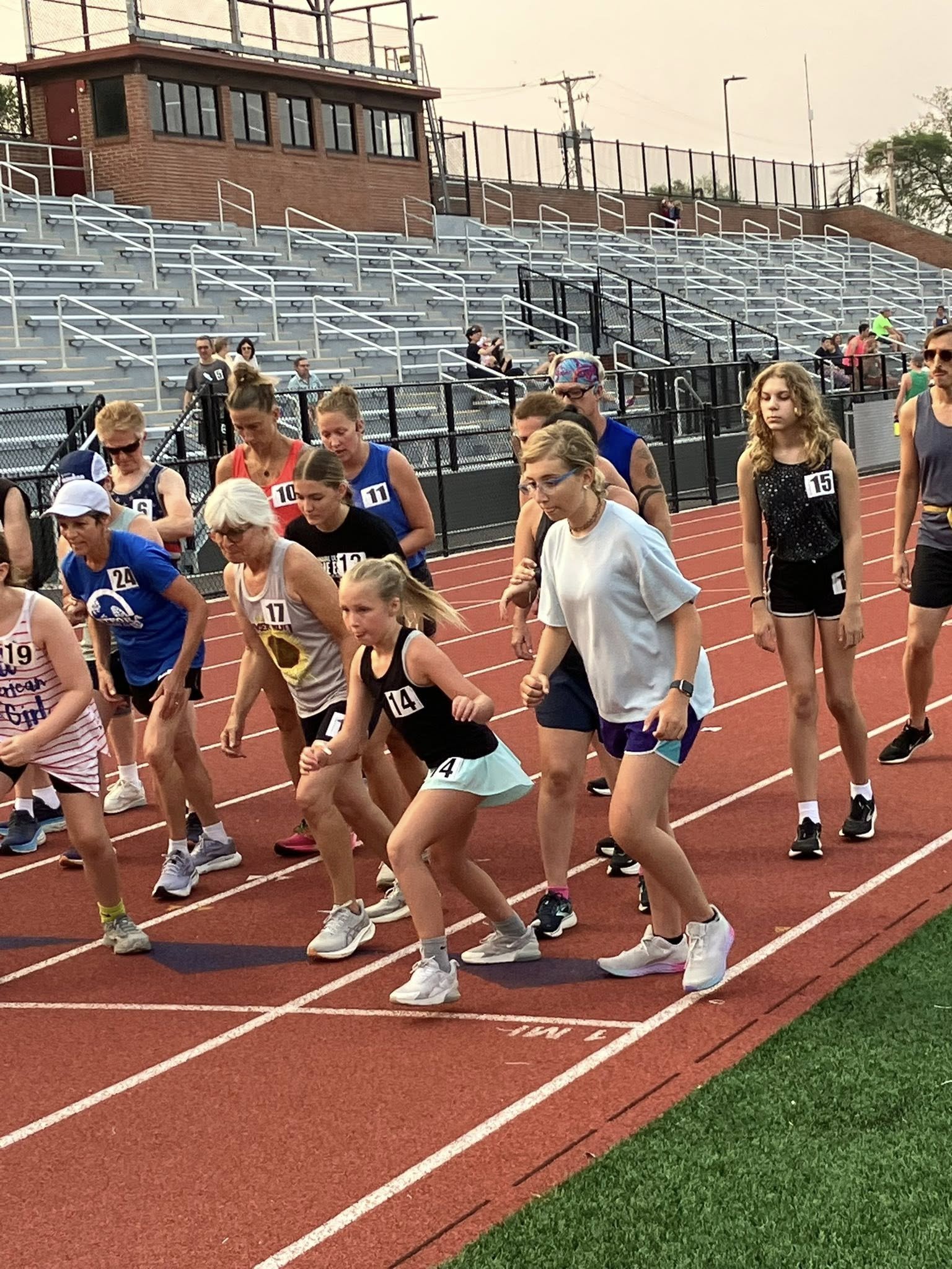 Awards are for the top overall men and women and the top three in each age group, starting with those under 13, 14-19, and then ten-year age groups from 20-29 up to 80+. Typically, we have had 6-7 heats. The first heat (fastest) will start at approximately 6:30 p.m. We will have short dash races on the infield turf for the youngest children at 6:20 p.m. We have a nuclear family team division of 3 members that must include at least one child and one parent.